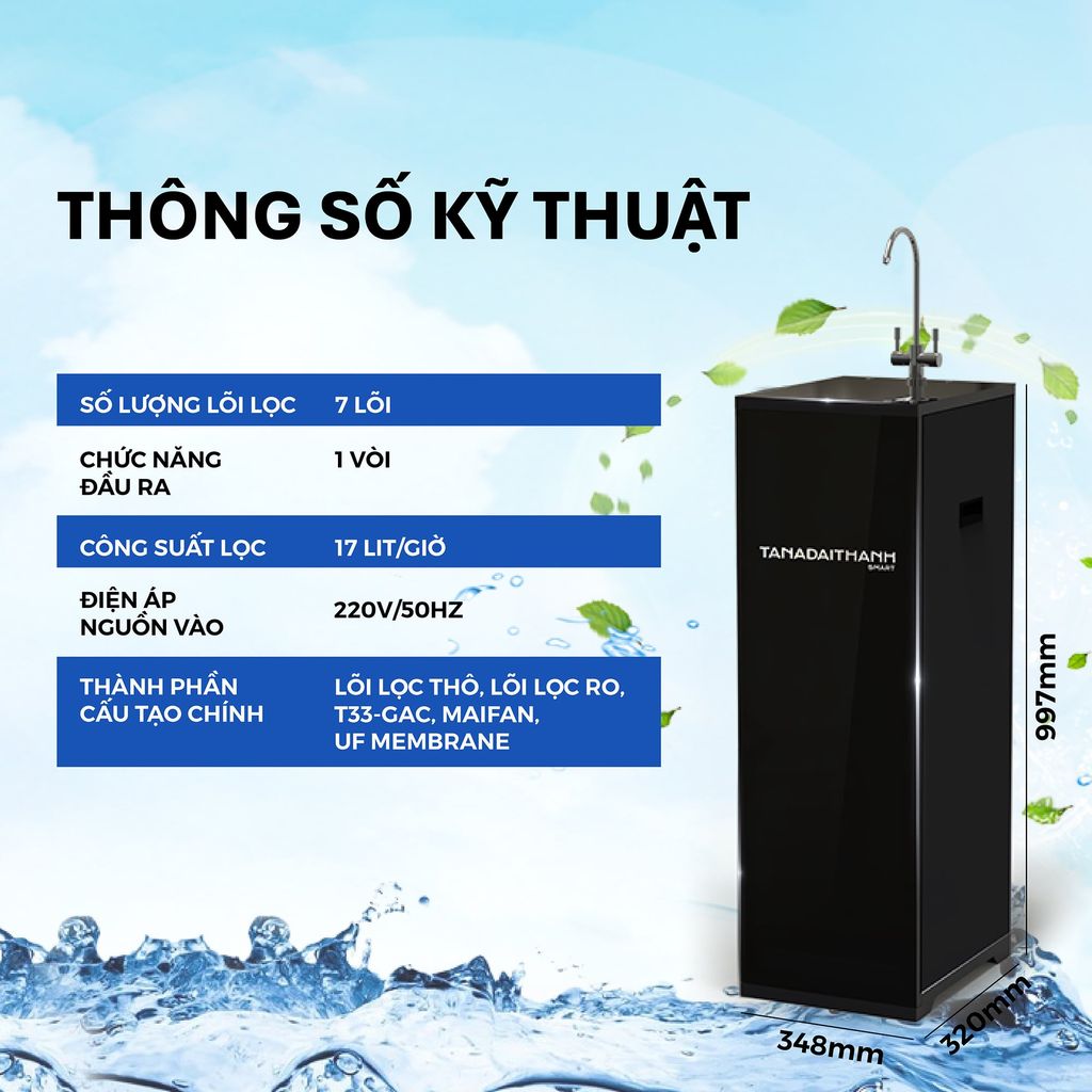 - Công suất lọc: 17 lit/giờ (phụ thuộc nguồn nước đầu vào)